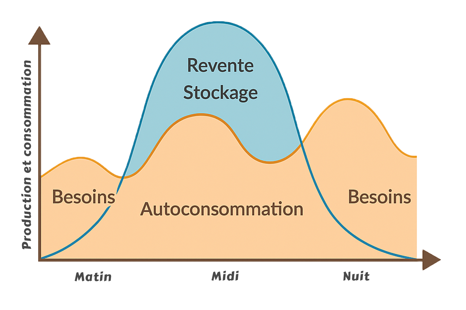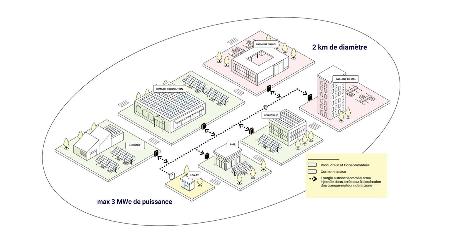 La production locale est partagée entre les participants selon des clés de répartition prédéfinies (smart metering). La baisse d’achats réseau réduit la facture globale.